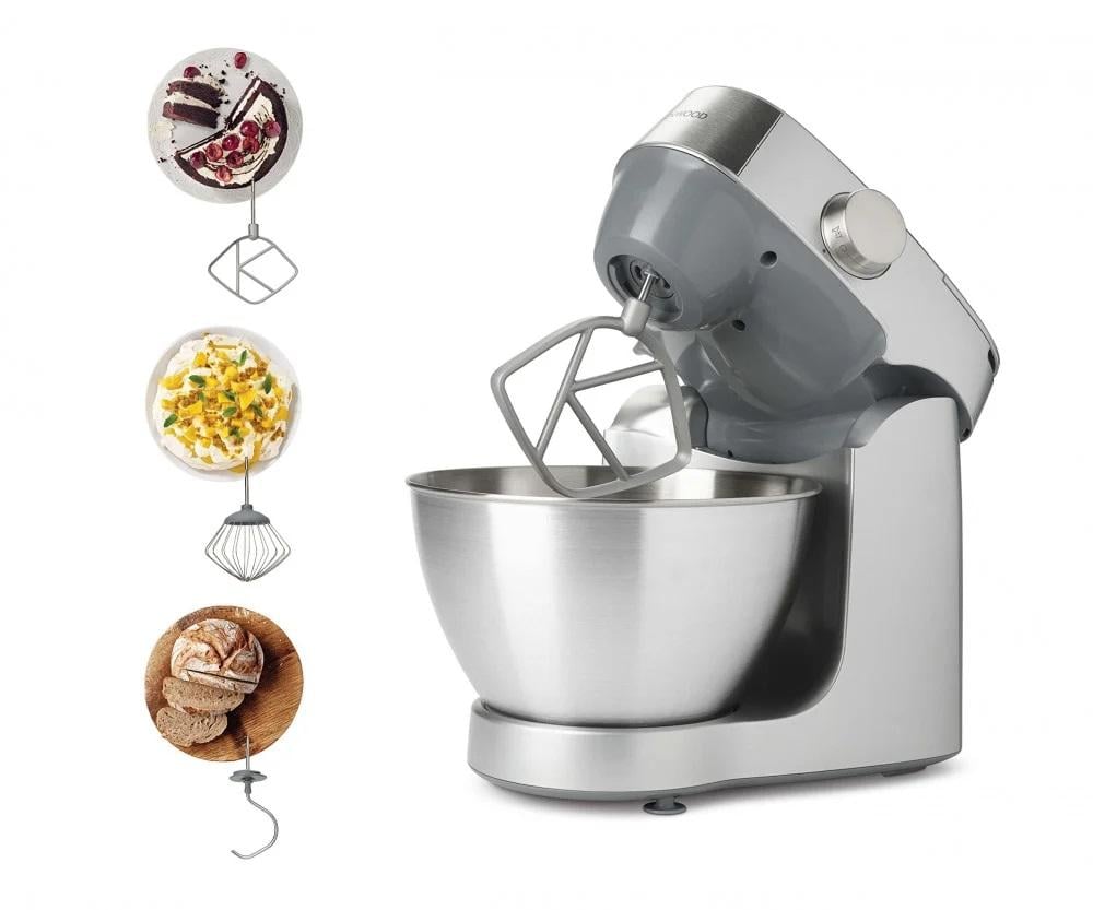 عجانة كينود قوة 1000 واط للمطبخ مع وعاء من استيل 4.3 لتر ومضرب علي شكل حرف K واداة خفق ومضرب عجين فضي