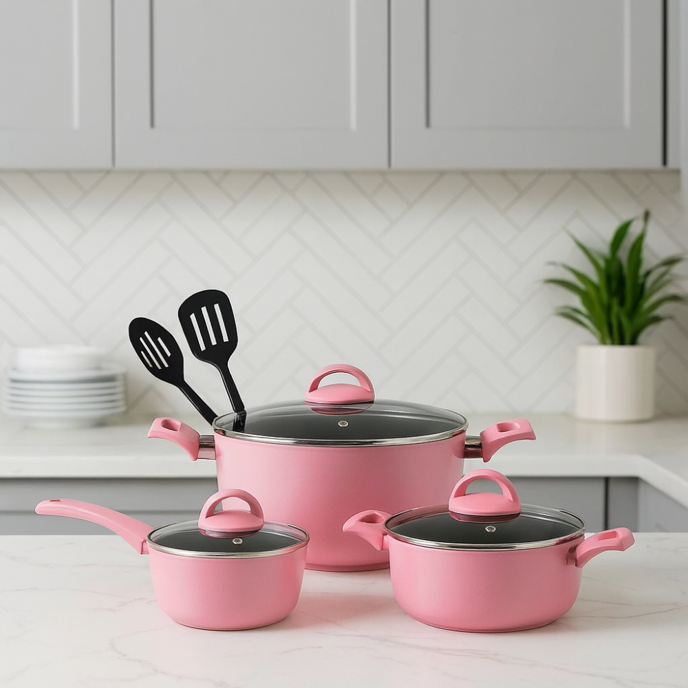 طقم قدور نيوفلون روز وردي بطبقة مانع الالتصاق بغطاء زجاج قدر 20-24 + كسروله 16 سم